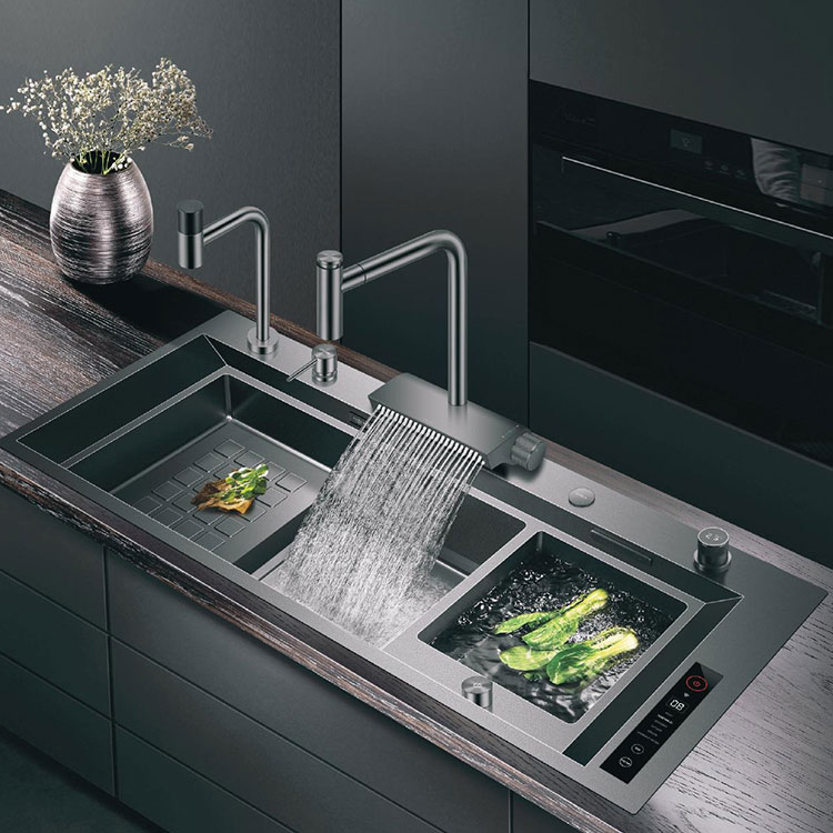 Werten Sie Ihre Küche mit dem übergroßen Nano Black Diamond Double Tank von Sink Kitchen auf, in dem Innovation, Stil und Individualisierung zusammenkommen. Vertrauen Sie darauf, dass MNBAM eine anspruchsvolle und funktionale Küchenlösung liefert, die die perfekte Verbindung von Technologie und Design widerspiegelt.